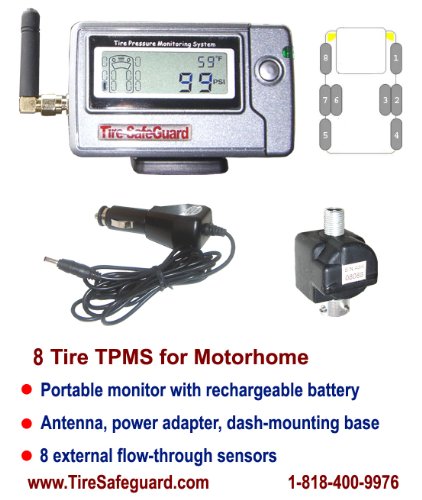 This 8 tire tire pressure monitoring system for an 8-tire motorhome has our patented flown-through sensors that enable refilling tire without sensor removal, it also has a dash-mounting monitor that shows tire pressure and temperature at all times. It alerts users to abnormal tire position as well as low and high tire pressure levels with alarm icons, red light, and an audible warning. The high pressure, high temperature, and per axle low pressure warning levels are user-adjustable. This item supports PSI/Bar and Fahrenheit or Celsius measurement units (user selectable). The light-weighted external cap sensor (.45oz) installing on the tire valve stem is waterproof and its battery is user-replaceable. The monitor has a rechargeable battery and is portable. The sensor signals have long range so therefore mostly it is not necessary for motorhomes and big rig tractors to install a signal booster. HCI developed the TPMS systems in USA by in-house engineers and make all products in its own factories.